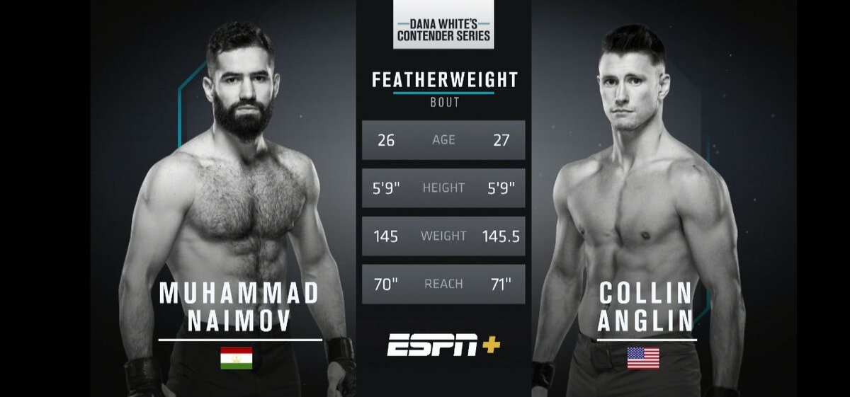 Мухаммад впервые в карьере проиграл и не получил заветного контракта с UFC. Сегодня ночью в США прошел турнир Dana white's contender series. Согласно правилам этого шоу, Дана выбирает среди победителей бойцов, которые будут подписаны в лучший промоушен мира UFC. Сегодня ночью мы все ожидали, что в организации появится первый таджикский боец Мухаммад Наимов. Ему 26 лет, он двухкратный чемпион мира по тхэквондо, он шел без поражений в смешанных единоборствах, был спарринг партнером Джастина Гэтжи, в октагон Мухаммад еще заходил крупным фаворитом. Как же сложился бой? В стойке бой был очень близким в первых двух раундах. И у Наимова и у его соперника Колина Энглина многое получалось. Это была настоящая битва с красивыми попаданиями, мощными ударами. Но к сожалению за минута до окончания второго раунда Колин смог провести тейкдаун забрать спину, и у него была минута , чтобы довести Мухаммада до того состояния, в котором опасности он представлять не будет. Большую часть третьего раунда Кол