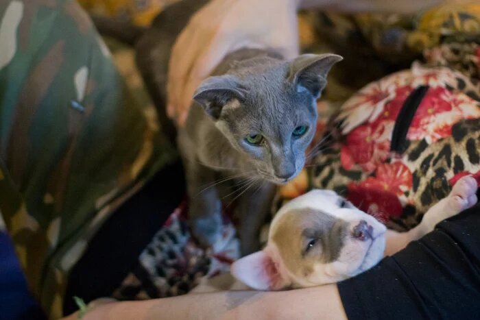Мой амстафф - овуляшка.Не знаю, как так получилось. Вероятно, все началось с того, что его, трехнедельного, усыновила кошка Беня. Мы привезли его поздно вечером. Проснувшись, Бенита обнаружила возле себя щенка размером с половину себя и крепко задумалась на часок. Кошка она была чудесная, но не очень умная, так что вывод она сделала такой: родила. Родила и забыла, ну бывает. Раз родила, придется растить. Ну она и растила. И когда к двухлетнему стаффу в дом принесли котенка Эя, которого нашли тонущим в шине с дождевой водой, Кай очень истерично требовал предъявить ему новичка. Признаться, я боялась. Мало ли. Здоровенная башка - больше котенка! - втиснулась ко мне на колени. Кай понюхал личинку кота. Вздохнул. И вылизал тому попу. Вид у собаки был ошарашенно-виноватый. - Помнишь, ты зайчика плюшевого вязал? - спросила добрая я. - Ну вот. Это тебе сын. Не знаю, гений Кай или даун. Мы пять лет вместе живем, а я все разрываюсь. Но версия с сыном его устроила. Так в нашем доме о