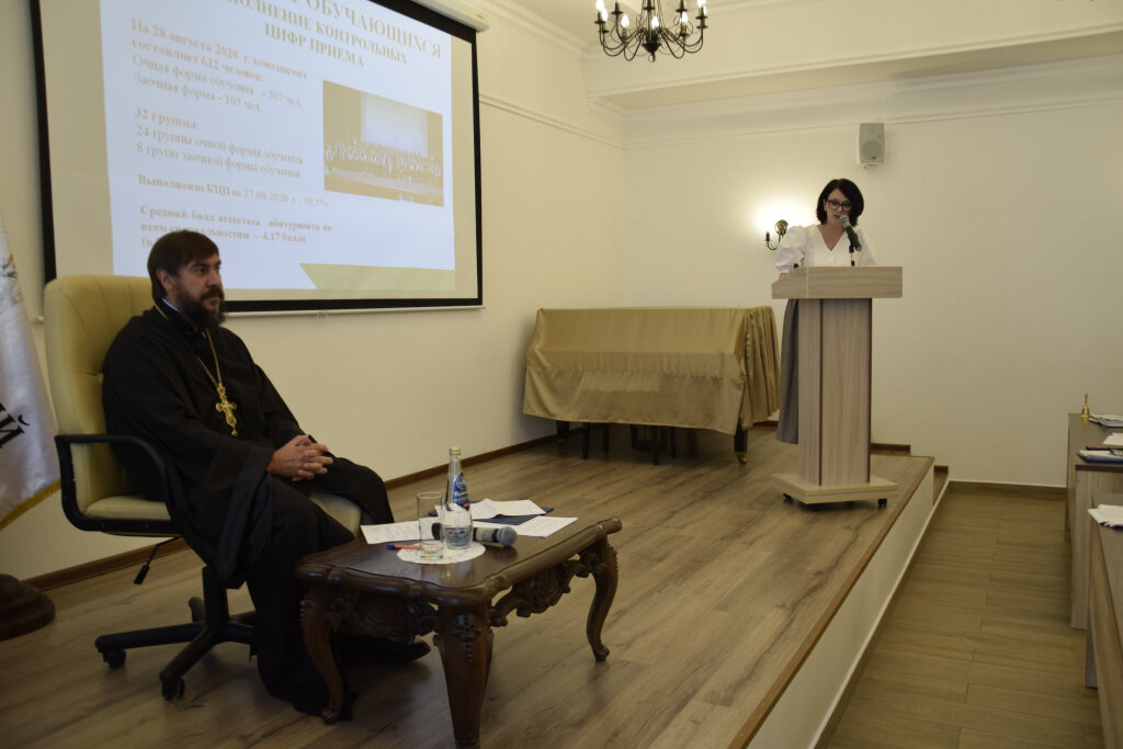 Об итогах работы Поволжского православного института в 2019/2020 учебном году и задачах на 2020/2021 уч.год рассказала первый проректор вуза Ольга Лышова. Так, одно из важнейших, даже исторических событий минувшего учебного года безусловно является визит в Православный институт Святейшего Патриарха Московского и всея Руси Кирилла, который дал высокую оценку деятельности нашего вуза. Также осуществляется сотрудничество с Тольяттинской епархией. Поволжский православный институт активно принимал учаcтие в Iепархиальных Рождественских чтениях; на базе нашего вуза и при непосредственном участии протоиерея Димитрия Лескина проходят курсы профессиональной переподготовки для священнослужителей Тольяттинской епархии; проводится VIII межрегиональный конкурс «Рождество в каждый дом»; фотоконкурс «В кадре православная молодежь»; XII общероссийская олимпиада школьников «Основы православной культуры». 8 февраля 2020 года в Самарской епархии состоялось подписание договора о сотрудничестве между Поволжским православным институтом и Самарским государственным социально-педагогическим университетом; состоялась презентация книжной коллекции С.М. Половинкина, открылся музейно-выставочный комплекс. Студенты Поволжского православного института активно принимают участие в различных олимпиадах и конкурсах, большое внимание уделяется научно-исследовательской деятельности. Поволжский православный институт принял участие во II Поволжском педагогическом форуме «Система непрерывного педагогического образования: инновационные идеи, модели и перспективы». Активно развивается научно-исследовательская деятельность студентов, научно-издательская деятельность вуза, проектная деятельность, музейно-выставочная деятельность, выставки. Задачи Поволжского православного института на 2020/2021 год: расширение линейки образовательных программ; прохождение профессионально-общественной церковной аккредитации по направлению подготовки «Теология» и т.д.