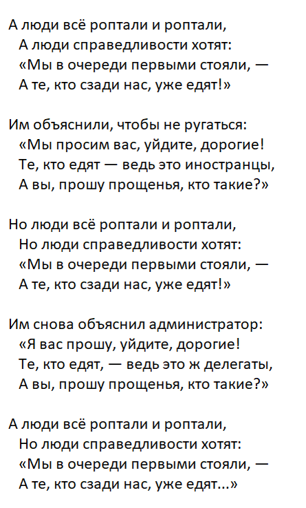 И говорят: «Ну как же так? Ну ёлки-палки! Ну в конце концов! Ну разве так можно? Ну сколько можно, а? Ведь мы в очереди, мы первыми стояли