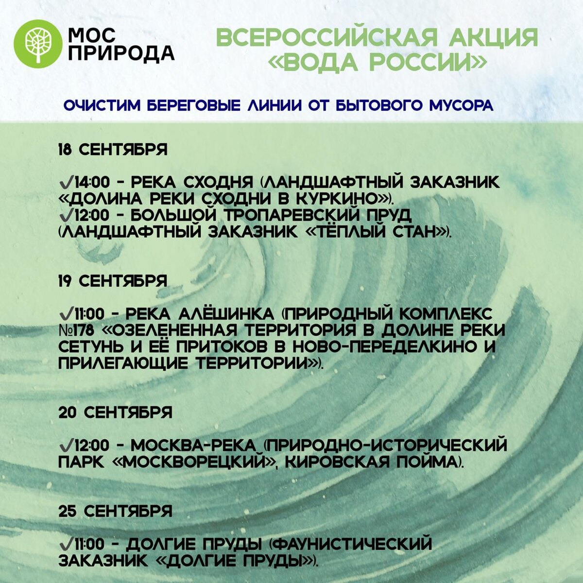 - 12:00 – Москва-река (природно-исторический парк «Москворецкий», Кировская пойма). Точка сбора: 55.813167, 37.410939, ул. Исаковского, напротив д.16, корп.1, у Кедрового поля памяти. Подробности: 8-499-726-61-75.
