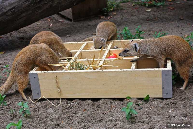 В Новосибирском зоопарке для мангустов и сурикатов смастерили кормовой ящик с отсеками для еды. Насекомые, кусочки фруктов и другие угощения сотрудники зоопарка смешивают с корой, шишками, соломой и цветами. Чтобы получить любимое лакомство, юрким животным необходимо проявить свои природные навыки. Новый способ кормления приводит к оживлению в вольере и спасает животных от скуки. В специальном кормовом ящике 12 отсеков. В каждый из них помещаются угощения для животных и туда же кладётся что-то другое, например, кора деревьев, солома, шишки, трава, листья и цветы. Мангусты и сурикаты рассматривают содержимое ящичков, принюхиваются, роются, ищут лакомства. Кормовой ящик с таким разнообразным содержимым занимает животных на длительное время. «Это один из примеров кормового обогащения среды. Новый способ кормления, вместо рутинного, приводит к оживлению в вольере. Животные с явным любопытством заняты поиском пищи, — рассказали сотрудники Новосибирского зоопарка. — Иногда, усложняя задачу,