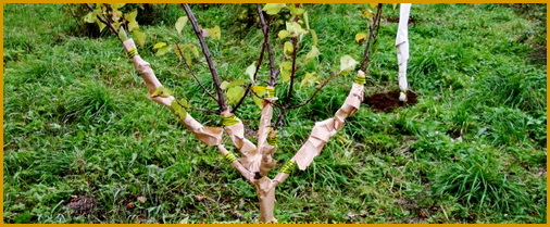 На зиму деревья не надо ничем укрывать. Любое укрытие — чулки, рубероид и прочее — затрудняют воздухообмен и могут привести к выпреванию. Допустимо лишь укрытие стволов лапником (иголками вниз) в тех местах, где водятся зайцы.