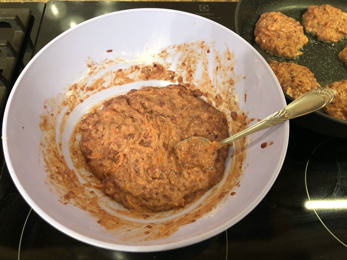 Измельчаем куриную печень, лук, добавляем куриный фар, морковь трем на мелкой терке, добавляем муку, крахмал, майонез,яйцо, специи. Все перемешиваем, чтобы получилась густая масса.