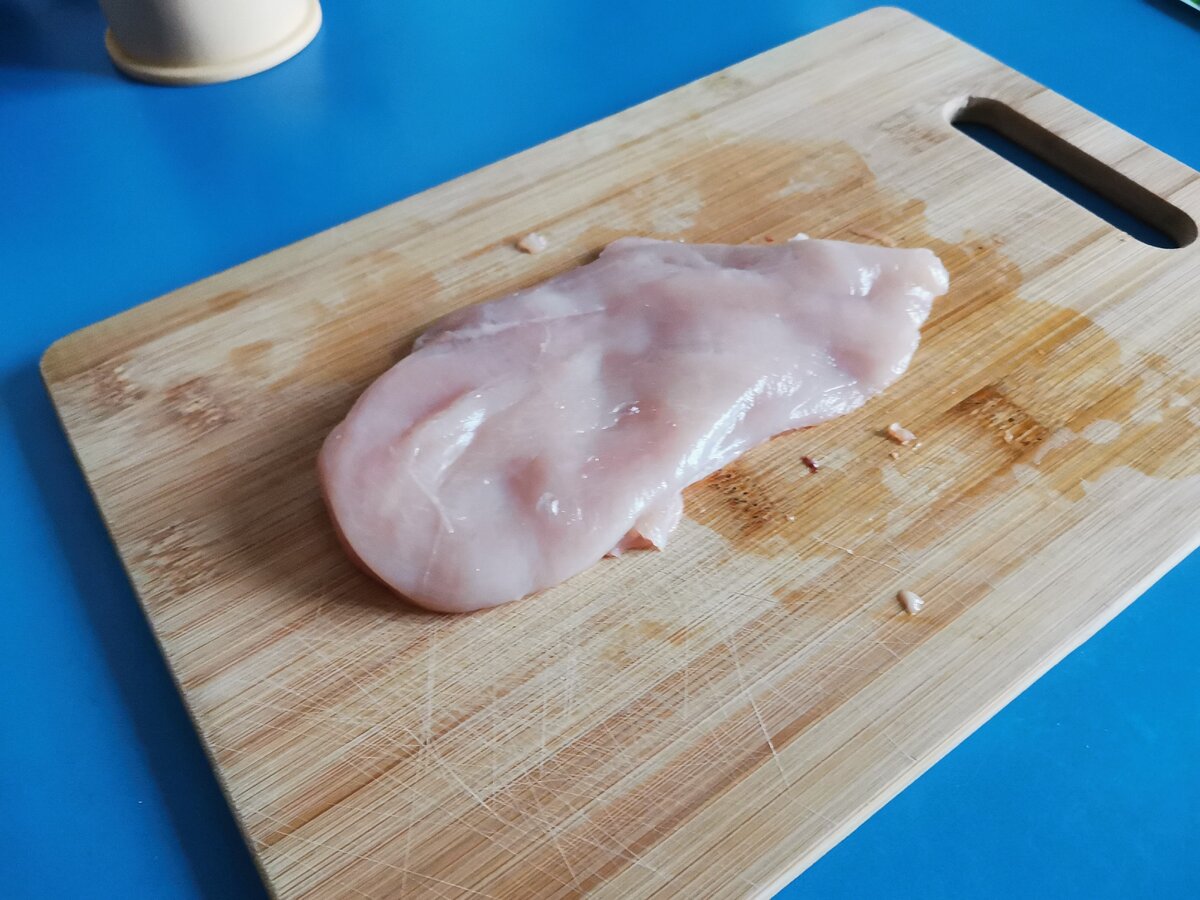 Для начала берем кусочек филе и разрезаем его вдоль по палам, чтобы был тоньше. Можно отбить без разницы в принципе.