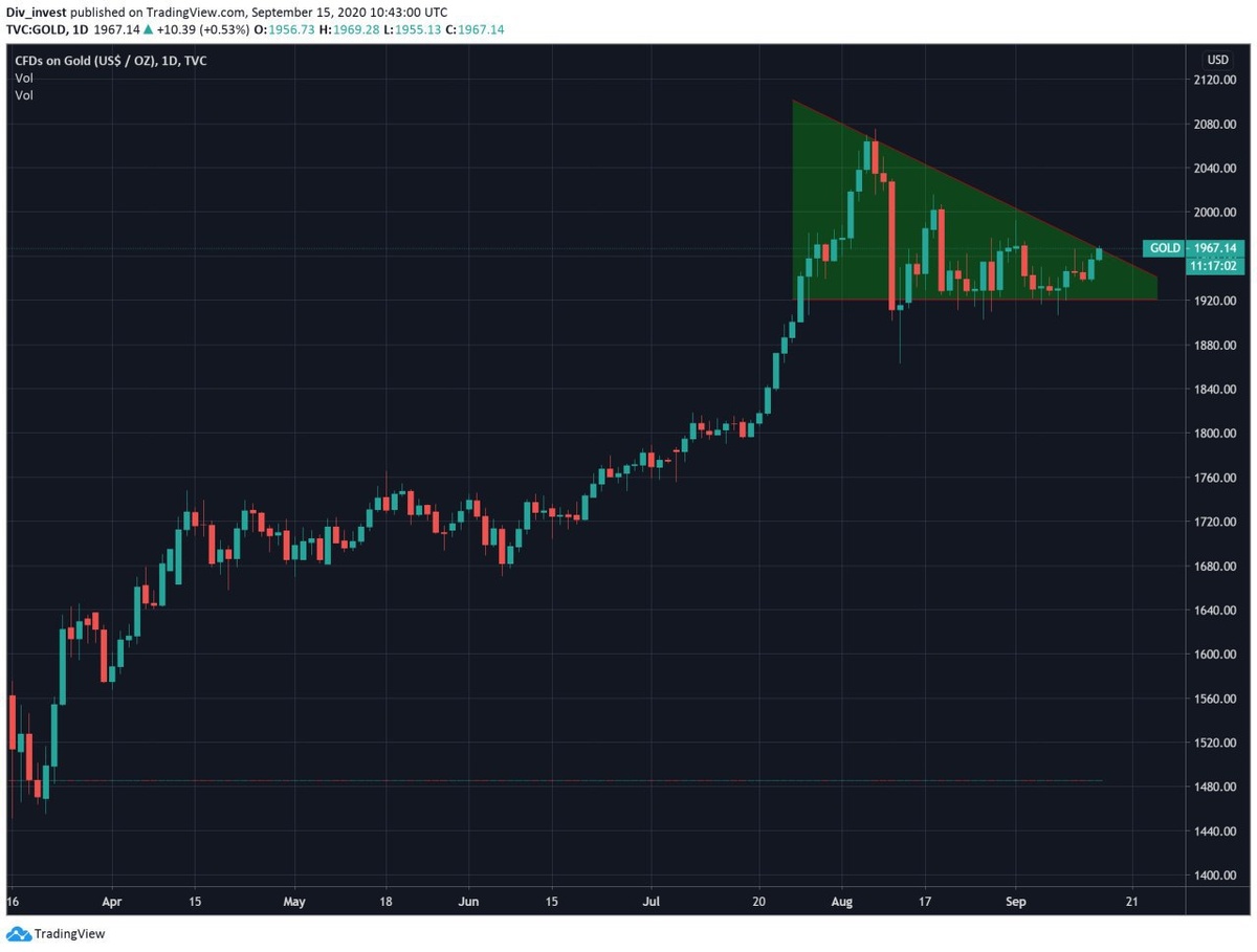 Давай посмотрим на график стоимости золота. На мой взгляд, на нем отчетливо формируется фигура Флаг с уровнем поддержки на $1920. Это значит, что уже в ближайшее время мы можем увидеть пробой и сильное движение вверх - до $2000 и далее.