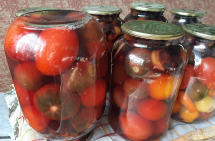 В стерильные банки укладываем вниз помидоры на 3/4 банки,