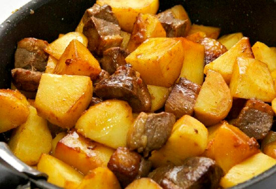 10) Когда картошка уже обжарилась и почти готова добавляем лук, особенно если ты не хочешь, чтобы он был готовым, если же ты адекватный человек, то лук будешь обжаривать вместе с мясом