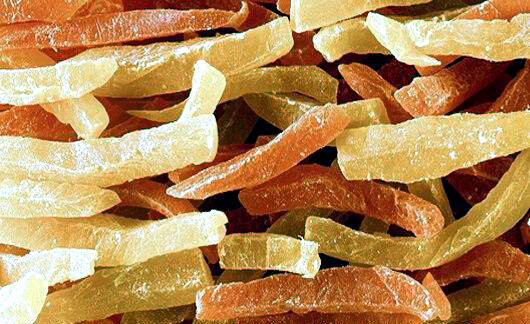 После того, как вы скушаете арбуз, не спешите выбрасывать арбузные корки. Соберите их в мешочек для последующего приготовления из них цукатов. Что нам понадобиться: Арбузные корки; Сахар 2 стакана; Лимонная кислота; Сахарная пудра или кукурузный крахмал; Пергамент для выпечки. Начинаем готовить Обрезаем собранные арбузные корки. Срезаем все красное и зеленое. После чего режем не слишком тонкой соломкой. Заливаем два стакана сахара 350 – 400 мл воды, добавляем лимонку по вкусу и ставим на огонь. Как только растворился сахар, сыпем в сироп нарезанные корки и доводим до кипения. Отключаем и даем остыть нашему вареву. Повторяем кипячение и охлаждение около 4 – 5 раз. После второго раза корки должны уже стать прозрачнее. После того, как завершили наши процедуры, сливаем сироп, а корки выкладываем на пергамент для выпечки. Выкладывайте тщательно. Каждая из долек не должна соприкасаться с соседкой. Ставим это все на медленный огонь и выпекаем до тех пор, пока они не станут похожи на сушеные