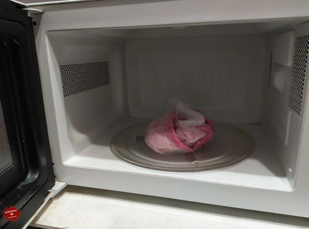 После того, как микроволновка сообщила вам о завершении работы, достаем пакет. Будьте аккуратны! Пакет очень горячий – берегите руки. Лучше всего вытащить полотенце из пакета и положить его в холодную воду. Далее нужно его прополоскать в теплой воде, чтобы смыть излишки мыла.
