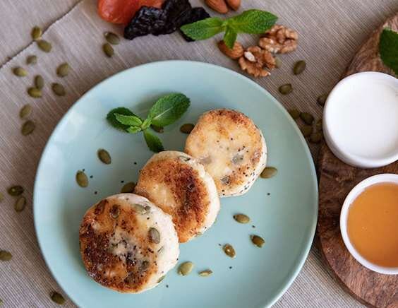 - Смешать творог, манку, яйца с сахарным песком и соль в миске, и тщательно перемешать блендером или руками. Добавить корицу, чиа, семена тыквы в массу. Вымесить до получения однородной массы. Поставить массу в холодильник на 10 минут.