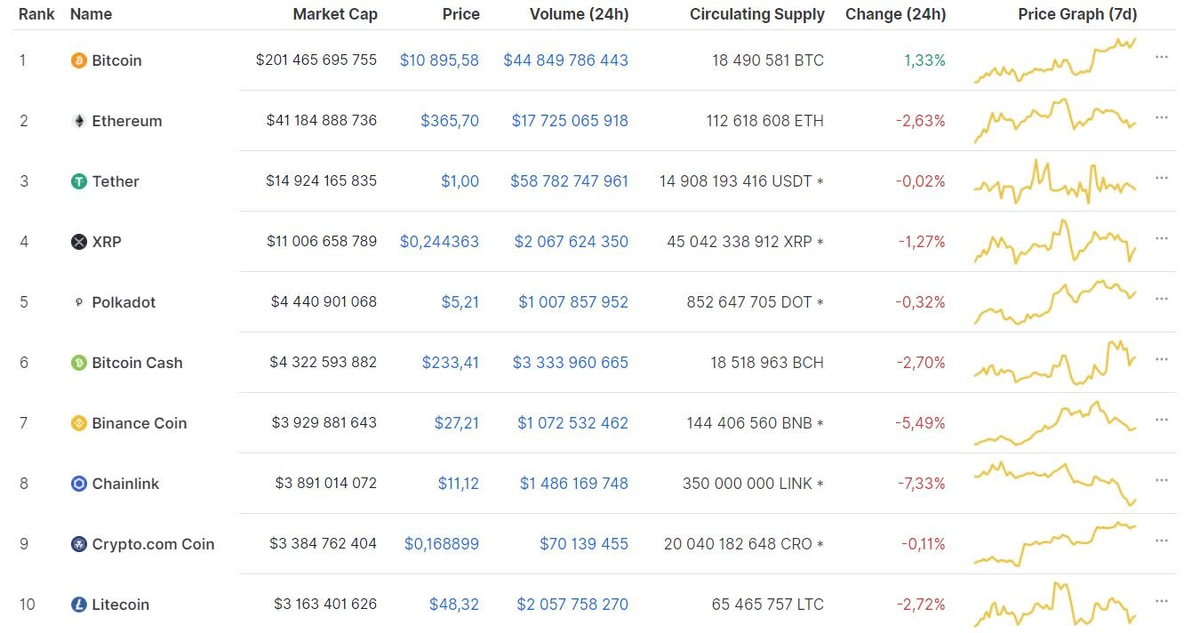 Большинство криптовалют из топ-10 рейтинга капитализации ресурса CoinMarketCap встретили среду падением. Bitcoin при этом сохранил позитивную тенденцию. По состоянию на 10:58 (МСК), криптовалюта торгуется по $10 895. Суточный рост цифрового актива составил 1,33%. Больше всех за 24 часа пострадал Chainlink (-7,33%).