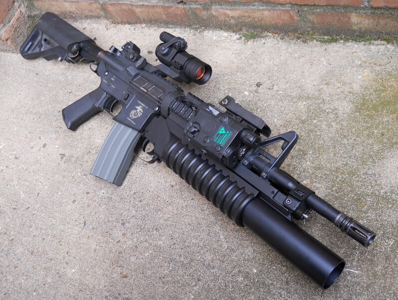 M4— укороченная версия M16A2. Ствол короче, дульный тормоз усилен, приклад телескопический, ручка для переноски съемная, на планке Пикатинни.