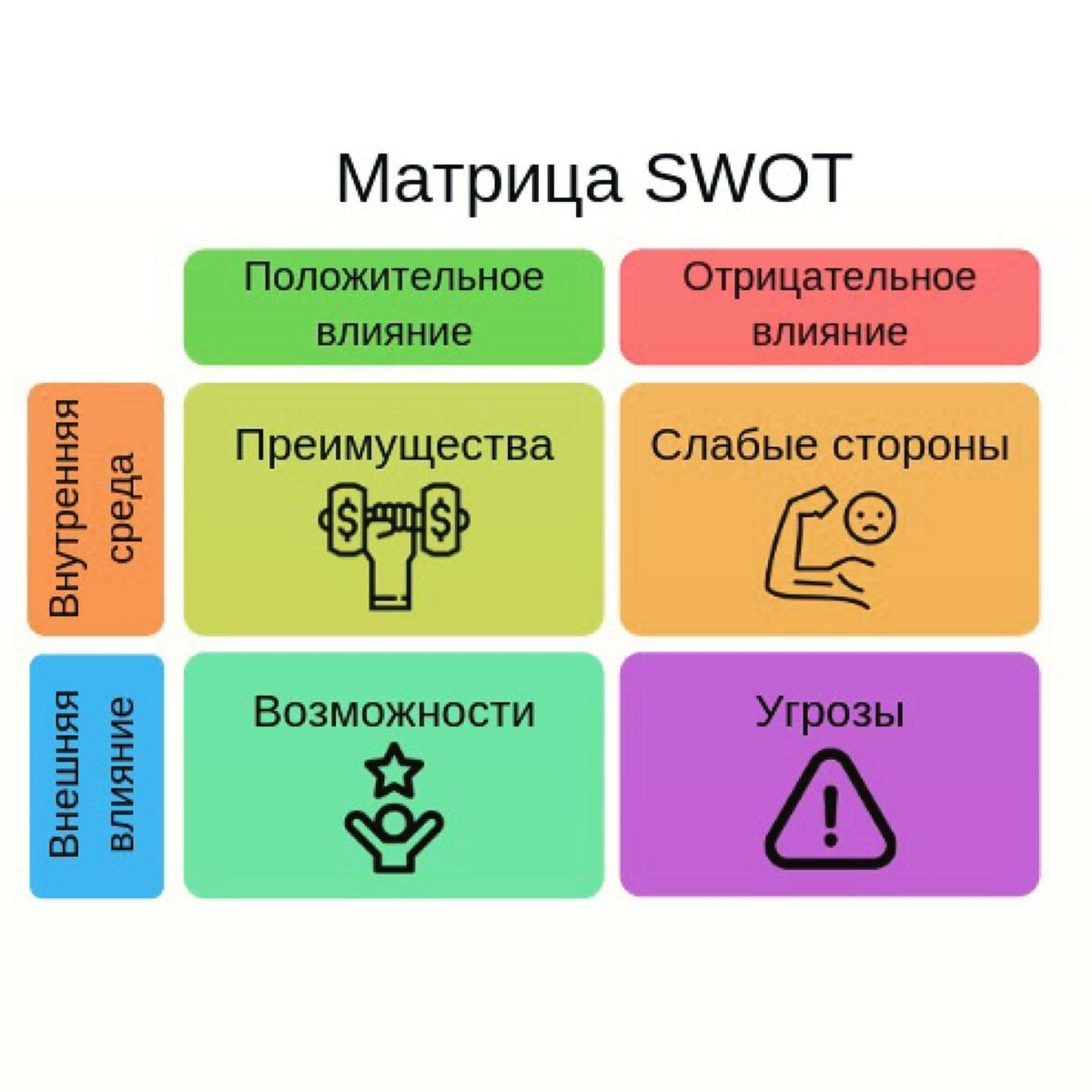 Всем привет! Сегодня я вам подробнее расскажу про SWOT-анализ. Он был впервые введён в 1963 году в Гарварде на конференции по проблемам бизнес-политики профессором Кеннетом Эндрюсом. Это самый простой и популярный метод, применяемый как для организаций так и для личных ситуаций. Аббревиатура SWOT-анализ расшифровывается так: Strengths- сильные стороны. Weakness- слабые стороны. Opportunities- возможности. Threats- угрозы. Основная задача данного метода заключается определением того, каким образом следует использовать потенциал внутренней среды и внешние возможности, чтобы минимизировать угрозы внешнего окружения и прорабатывать слабости. Как и у всех методик есть свои плюсы и минусы. Поговорим сначала о достоинствах: 1. Универсальность и возможность использовать абсолютно в любой сфере. 2. Возможность адаптировать под любой объект или ситуацию. 3. Гибкость, проявляющаяся в зависимости от поставленных целей. 4. Возможность использовать метод как для планирования так и для оперативного