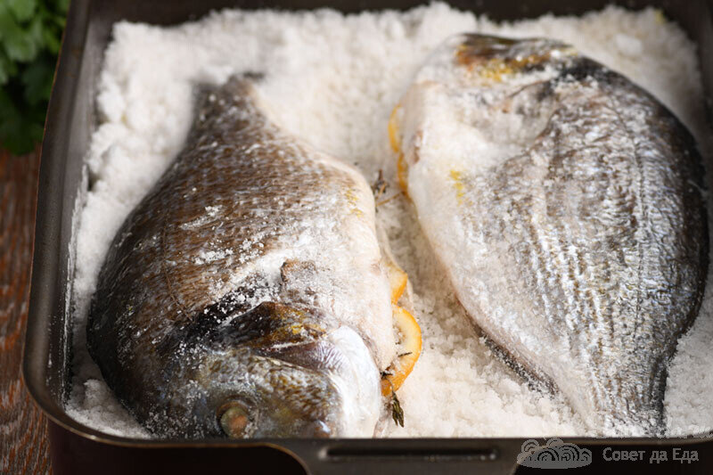 6. Закрываем дорадо остатками соли, формируя горки. Ставим в духовку, предварительно включенную на 200 градусов, и запекаем 35 минут. Хотя рыба и покрыта большим количеством соли, но на кухне все равно появляется потрясающий аромат запеченной рыбы.