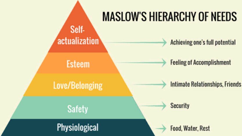 В классической схеме пирамиды американского психолога Абрахама Маслоу, лежит 5 иерархических уровней. Если нижние не удовлетворены, верхние проявляются менее слабо или отсутствуют.