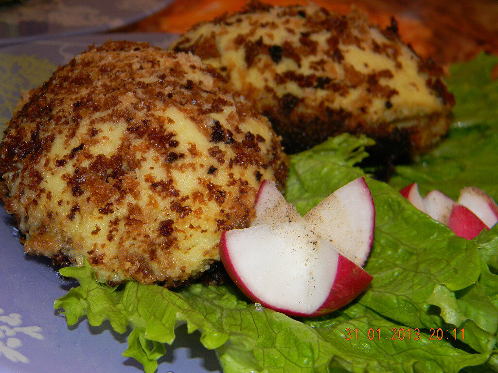 Теперь только осталось налепить обычные "котлеты" из пюрешки (причём довольно крупненькие), внутрь укладывая шпротную массу. Обвалять каждую зразу в сухарях и жарить в масле. Усё! Разве есть что-то сложного?