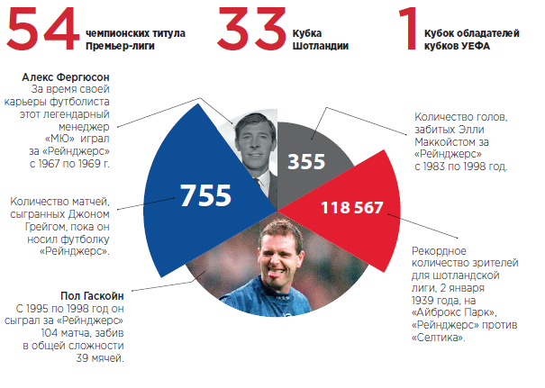 Легенда «Рейнджеров» началась в 1872 году, когда четверо друзей решили основать собственный футбольный клуб просто ради удовольствия. В 1891 году клуб выиграл первый чемпионат шотландской лиги, а потом еще пятьдесят три титула — что является мировым рекордом — в том числе девять подряд, с 1989 по 1997 год, под руководством тренера Грэма Сунесса. В течение 1960-х и 1970-х годов европейские клубы играли на «Айброкс Парк», домашнем стадионе «Рейнджерс» с 1899 года. Дважды заняв второе место на Кубке обладателей кубков, в 1961 и 1967 годах, они наконец взяли этот трофей в 1972 году. В 2008 году клуб дошел до финала Кубка лиги Европы УЕФА, и пока это последний раз, когда шотландский клуб заходил так далеко. Ряд серьезных трудностей вынудил клуб спуститься в четвертый дивизион в 2012 году, давая ему возможность побить еще один мировой рекорд — по количеству зрителей на матче этой категории: 49 118.