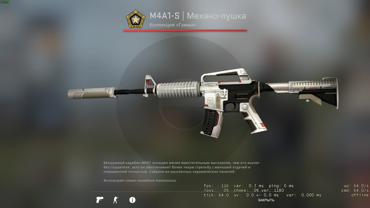 Открывает нашу подборку M4A1-S | Механо-пушка. Качество- после полевых испытаний. Цена начинается от 674 рублей. Собрано из закалённых керамических панелей. Выпадает из кейса "Гамма".