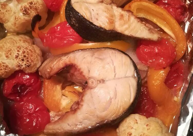 Поставьте духовку греться на 200°С. Поместите на овощную подушку рыбные стейки. Накройте все ингредиенты фольгой. Отправляйте запекаться на 30 минут. Потом уберите фольгу и верните в духовку на 10-15 минут, чтобы появилась лёгкая красивая корочка.