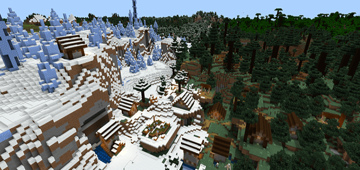 Спаун в Майнкрафт Бедрок считается выгодным, если рядом находится деревня. Еще выгоднее, если рядом не только деревня, но и множество биомов. Самым большим сюрпризом сида является храм джунглей, дойти до которого можно сразу после спауна в Minecraft Pocket Edition. Рядом расположены биомы джунглей и биом ледяных шипов. Чуть дальше от деревни находится иглу, форпост и еще одно скрытое