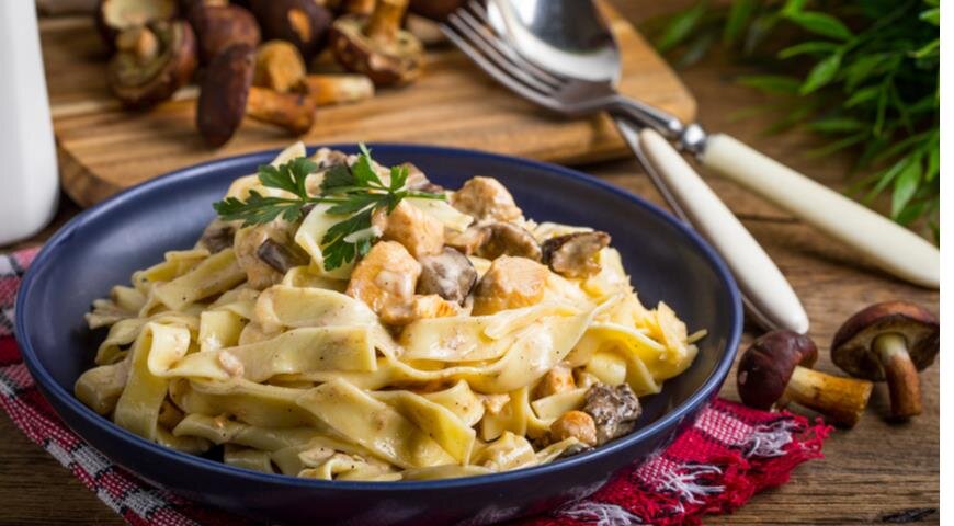 7) Соль, перец, специи по вкусу Для начала отвариваем макароны Баветте. Можно использовать спагетти или другие виды макаронных изделий, но я использовал именно эти. Отвариваем их до состояния Al Dente. Сливаем в дуршлаг, не ополаскивая водой и отставляем в сторону. Нарезаем мелко лук, грибы и курицу. На разогретую сковородку добавляем чуть чуть растительного или сливочного масла и засыпаем лук. Как только лук станет слегка золотистым, мы добавляем грибы. Жарим все, пока из грибов не выйдет вся влага. Затем добавляем курицу и д