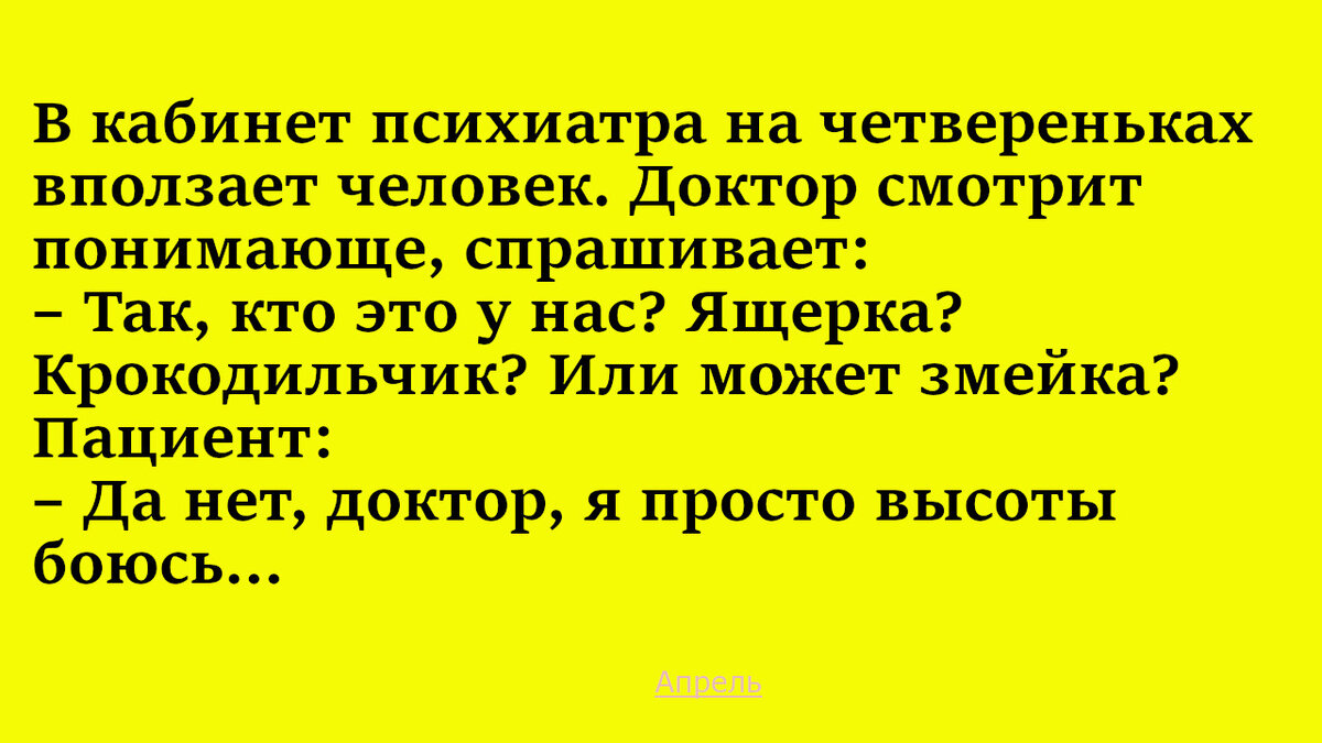 Здравствуйте, дорогие читатели! Развлекательный журнал "Апрель" как всегда, на страже вашего хорошего настроения! Так что скорее читайте новый выпуск весёлых историй и заметок! *** Заходит мужчина в автобус. Сел на переднее место. Водитель смотрит в заркало и объявляет в микрофон: - Мужчина, это место для граждан с маленькими! Мужчина сидит. Hарод укоризненно смотрит в его сторону. Водитель снова: - Мужчина! Я же объяснил! Это место для граждан с маленькими! Тогда пассажир не выдержал: - Так что же мне из-за двух остановок обрезать половину? *** Едет в телеге мужик. Приятель ему кричит: – Что везешь? Тот ему шепотом отвечает: – Овес. – А почему тихо разговариваешь? – Чтобы лошадь не услышала. Не везёт, так не везёт: Ещё пару станций: Вы уж определитесь: Но есть один недостаток: *** Мужика в давке сильно прижимают к окну автобуса на задней площадке. Мужик вскрикивает. Его сосед заботливо спрашивает: – Что, стекло? – Нет, еще стекает… Понимающий: Тут не поспоришь: Коронавирус, удалёнка,