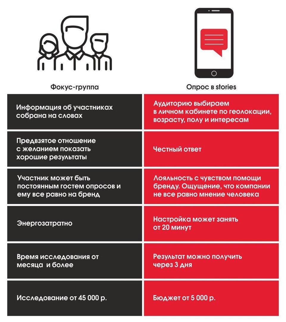Более быстрого и выгодного канала для исследования, пожалуй, не найти. Бюджет можно установить от 5 000 рублей и задать определенные параметры для опроса: возраст, география, интересы. Реакция будет незамедлительной. Обратная связь придет буквально через пару часов после модерации.