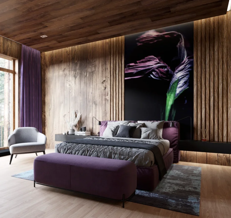 В этой спальне намеренно сгустили отделку. Нам хотелось камерного звучания. К тонированной вагонке добавили фиолетовых акцентов👩🏻🎤 Текстиль, картина и штукатурка здорово дополнили этот интерьер