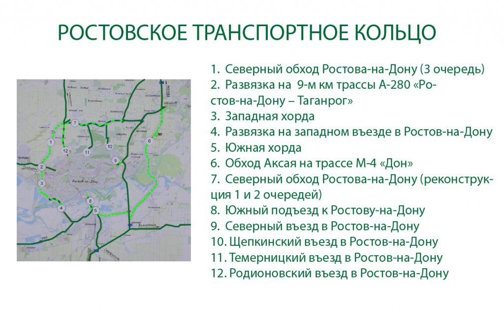 Южный обход Ростова-на-Дону. Так называемая «Южная хорда» - это участок дороги протяженностью 10 км, который замкнет Ростовское транспортной кольцо по новому направлению. Он соединит Южный подъезд к Ростову-на-Дону с трассой М-4 «Дон». Предварительная стоимость его проектирования и строительства - 9,5 млрд рублей. Реализация проекта может дать дополнительный импульс в освоении левобережной части реки Дон, между Ростовом и Батайском. Вместе с тем с точки зрения приоритетности он не является первоочередным, отметили в Управлении.