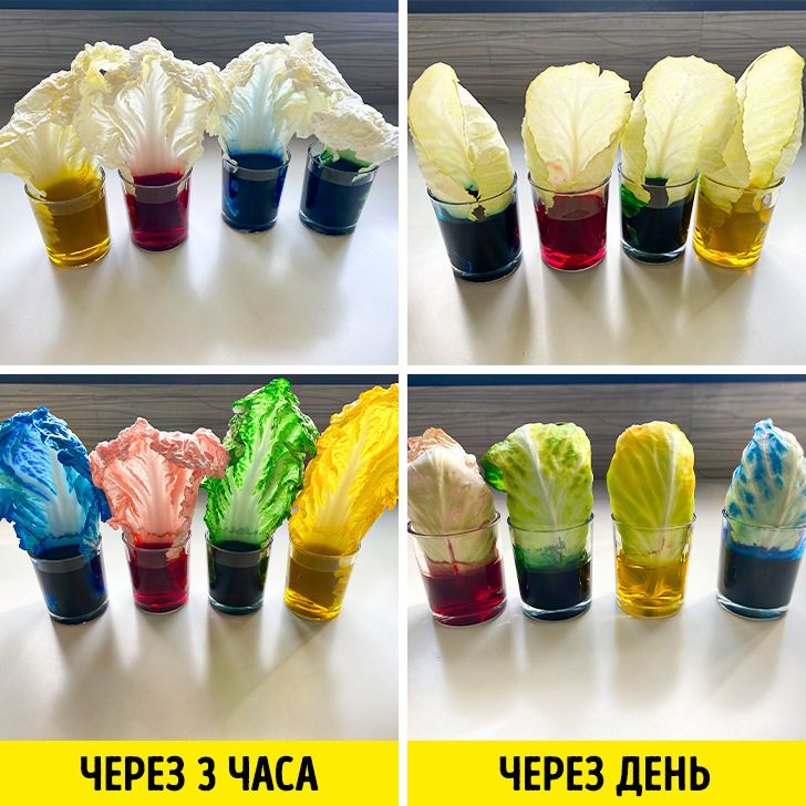 Что должно получиться: листы начнут пить воду и изменят цвет. Мы сначала проводили этот эксперимент, используя вместо пищевых красителей гуашь. С гуашью ничего не получилось. Листы завяли, но сохранили свой природный цвет. Зато если проводить опыт с пищевыми красителями, то по завершении его можно не только объяснить ребенку, как растение пьет воду, но и сделать необычный разноцветный и вполне съедобный салат.
