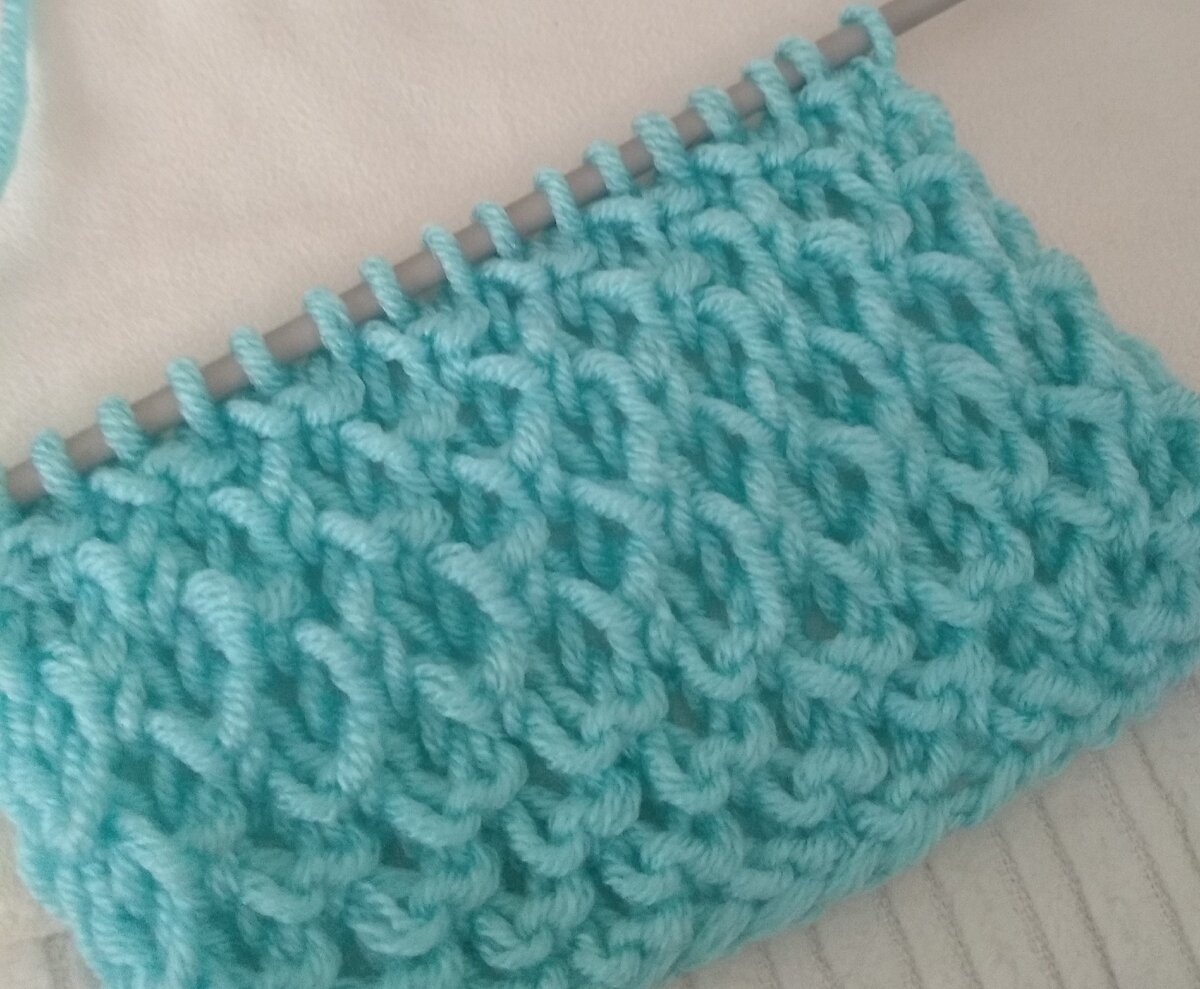 Может применяться в качестве основного узора или в комбинации с другими. Мягкий, уютный, пышный- если вязать толстой пряжей, то полотно получается очень теплое. Свитера, пледы, детские вещи - подойдет везде. Очень быстро вяжется. Раппорт: Четное количество петель+ 2 кромочные; 4 ряда. 1-й ряд (изнаночный) : кромочная, все лицевые петли, кромочная. 2-й ряд (лицевой): кромочная, * 1 лицевая, 1 лицевая из петли на ряд ниже