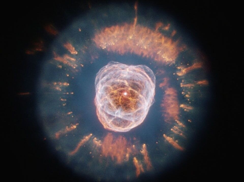 Газовые облака в туманности NGC 2392 имеют очень сложную структуру, которую пока не удается полностью объяснить. NGC 2392 – планетарная туманность с двойной оболочкой, более далекий газ состоит из внешних слоев похожей на Солнце звезды, которые были сброшены всего 10 тыс. лет назад.