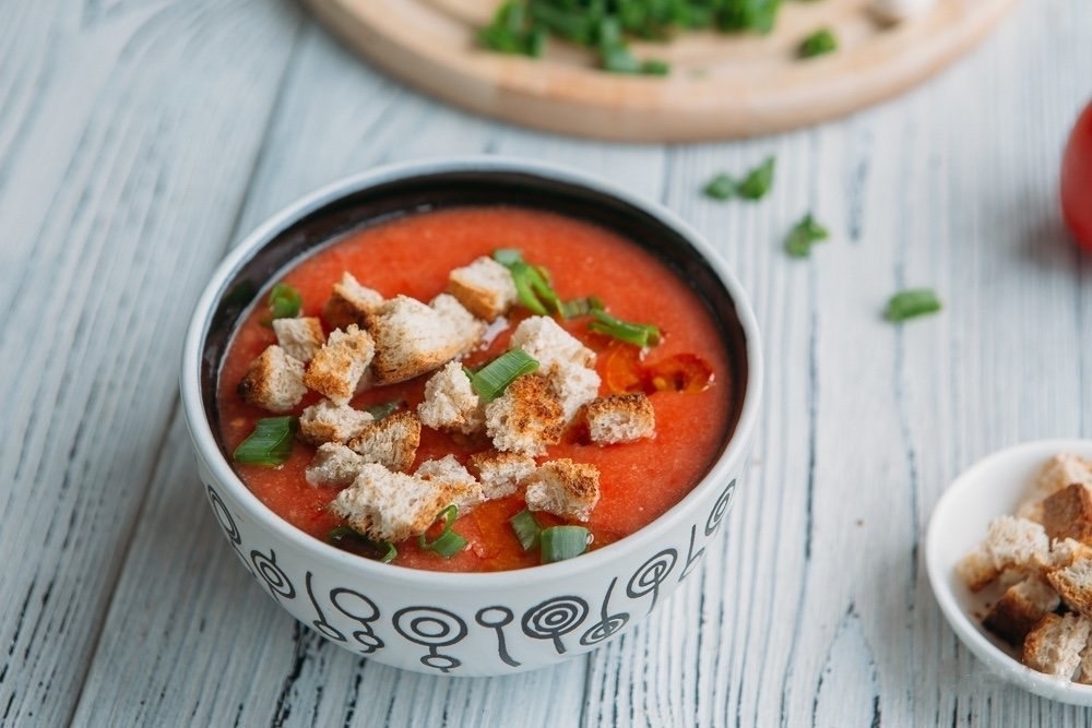 Холодный суп гаспачо Поделись рецептом с другом ✏️ Ингредиенты: Спелые помидоры — 1 кг Огурец — 1 шт. Болгарский перец — 1 шт. Маленькая луковица — 1 шт. Белый хлеб — 1 ломоть Чеснок — 2 зубчика Лимонный сок — 1–2 ст. л. Оливковое масло — 2 ст. л. Соль — по вкусу Приготовление: 1. На каждом помидорчике делаем крестообразный разрез около плодоножки, опускаем каждый помидор на минуту в кипяток, даем остыть и снимаем кожицу. 2. Вырезаем плодоножки, кладем в чашу блендера. 3. Туда же добавляем предварительно очищенный красный перец, огурец без шкурки, чеснок, луковку и ломоть хлеба. Тщательно измельчаем. Добавляем оливковое масло, лимонный сок, соль по вкусу. При желании можно добавить немножко перца чили. Тщательно перемешиваем, ставим в холодильник на 2–3 часа настояться. Приятного аппетита!