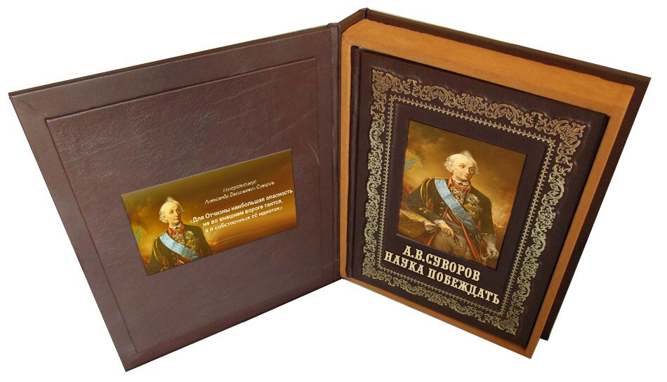 Страниц: 448 (Мелованная) Масса: 2054 г Размеры: 311x248x28 мм Подарочная книга, кожаный переплет Знаменитый трактат А. В. Суворова "Наука побеждать". В книгу также вошли автобиография А. В. Суворова, описания битв и походов знаменитого военачальника, наиболее полная коллекция афоризмов и высказываний А. В. Суворова, а также стихи известных русских поэтов о великом полководце и подробнейшая хронология жизни и деятельности А. В. Суворова. Подарочные книги.ру