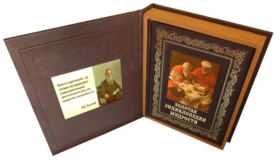 Формат: 316х248х38 мм, кол-во страниц 704. Подарочная книга, кожаный переплет «Золотая энциклопедия мудрости» дает вам замечательную возможность ознакомиться с собранием изречений выдающихся людей всех времен и народов. Авторы высказываний – философы и писатели, политики и полководцы, ученые и педагоги, проповедники всех мировых религий, художники и музыканты. Откройте эту удивительную книгу – и вы обязательно найдете мудрое изречение, которое станет вашим девизом и поможет преуспеть в жизни!" https://podarochnieknigi.ru/zolotaya-ehnciklopediya-mudrosti-v-korobe-zv-3