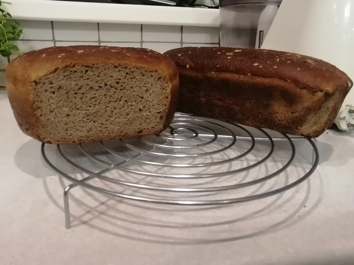 Выпекаем хлеб при температуре 240 градусов с паром первые 10 минут, затем пар выпускаем и допекаем при 200гр.С примерно 45 минут. На выходе получается круглая и прямоугольная буханки около 760 грамм каждая.