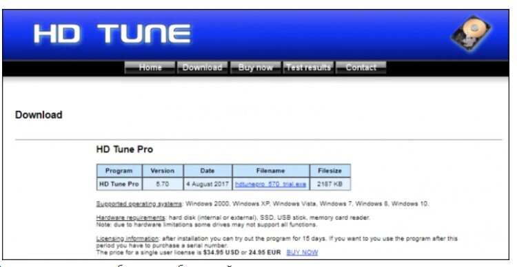 Итак, приступим. Для начала нам потребуется программа HD Tune Pro. Распространяется она в двух версиях: платная и бесплатная (пробная). Дорогущая версия за 35 долларов нам ни к чему, поэтому скачаем бесплатную (срок действия 15 дней) с официального сайта. Никакая регистрация не нужна.
