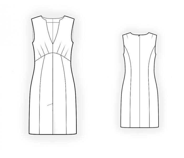 11. На деталях подкладки стачать вытачки, рельефные срезы спинки, боковые и плечевые срезы аналогично деталям верха. Обметать средние срезы спинки, полочки и нижний срез. Притачать правую часть подкладки к внутреннему срезу обтачки полочки. Отогнуть обтачку полочки на лицевую сторону, совместить срезы горловины основного изделия и подкладки. Не доходя по 5 мм до краев потайной застежки подкладку отогнуть и приколоть к верхнему срезу платья. На лицевую сторону платья отогнуть припуски вдоль застежки–молнии и приколоть к срезу горловины поверх подкладки. Обтачать срез горловины. Припуски на закруглениях рассечь, детали вывернуть на изнаночную сторону и приутюжить. Припуски вдоль застежки отогнуть на изнанку и прикрепить к тесьме молнии. Аналогично обрабатывается левая часть. Стачать средний срез подкладки полочки. Обтачать пройму подкладкой в два приема. Скрепить подкладку с изделием по нижнему срезу подкладки полочки.