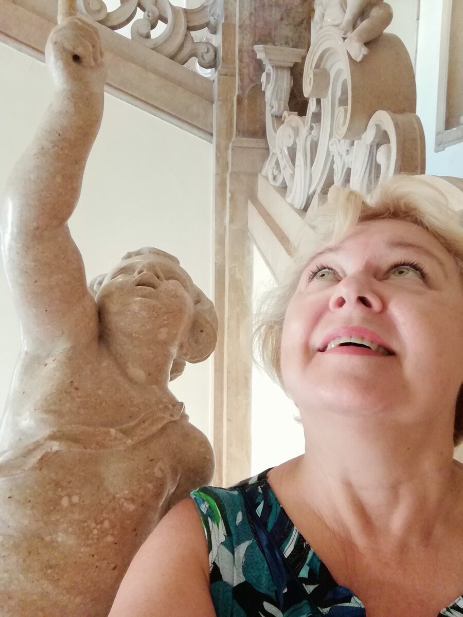 Поднимаясь по лестнице, я фоткалась с амурчиками и, наконец, дошла до Мраморного зала, - это красота! Золотой зал в стиле барокко, освещенный огромными окнами и такими же зеркальными окнами напротив, дает посетителю заряд позитивности и удовольствия.
