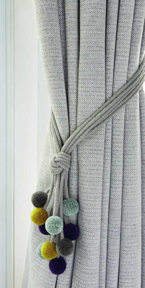Тут наши умения могут вдоволь разгуляться! А какой простор для фантазии, вот например - обычный шнур, в несколько сложений и подобранный в тон к шторам, украшен шерстяными помпонами, они могут быть по цвету монохромными или наоборот яркими.