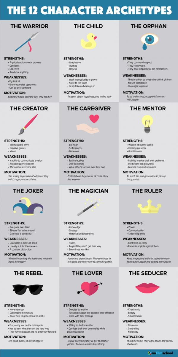 По сути, это фундамент, чтобы понять к каким типам персонажей относятся наши герои в художественных произведениях или сценариях. Мне нравится использовать эти формы, чтобы узнать чего ждёт персонаж или чего он хочет. Я думаю, что архетипы являются полезными инструментами, которые помогают вдохновить и вдохнуть жизнь в героев на ваших страницах.