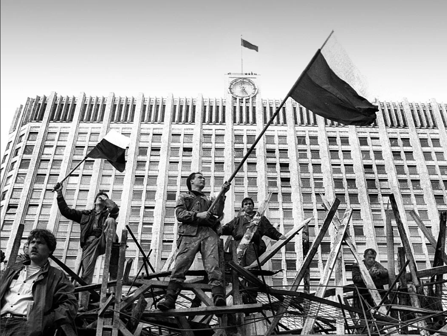 Ельцин, Борис; распад Советского Союза Русский Pres. Борис Н. Ельцин (в центре) стоит на бронетранспортере, припаркованном перед Белым домом в Москве, вместе со сторонниками, держащими флаг Российской Федерации, 19 августа 1991 года.