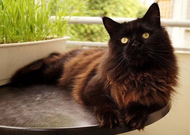 Для того, чтобы кошка была действительно черной, требуется генетический компонент, который называется геном черного. Кроме того, черной кошке нужен особый вид диеты, богатой аминокислотой тирозин. Тирозин производит эумеланин, пигмент, из которого состоит черный мех. Если вашему черному мейн-куну не хватает тирозина, его шерсть обесцветится и станет ржаво-оранжевой.