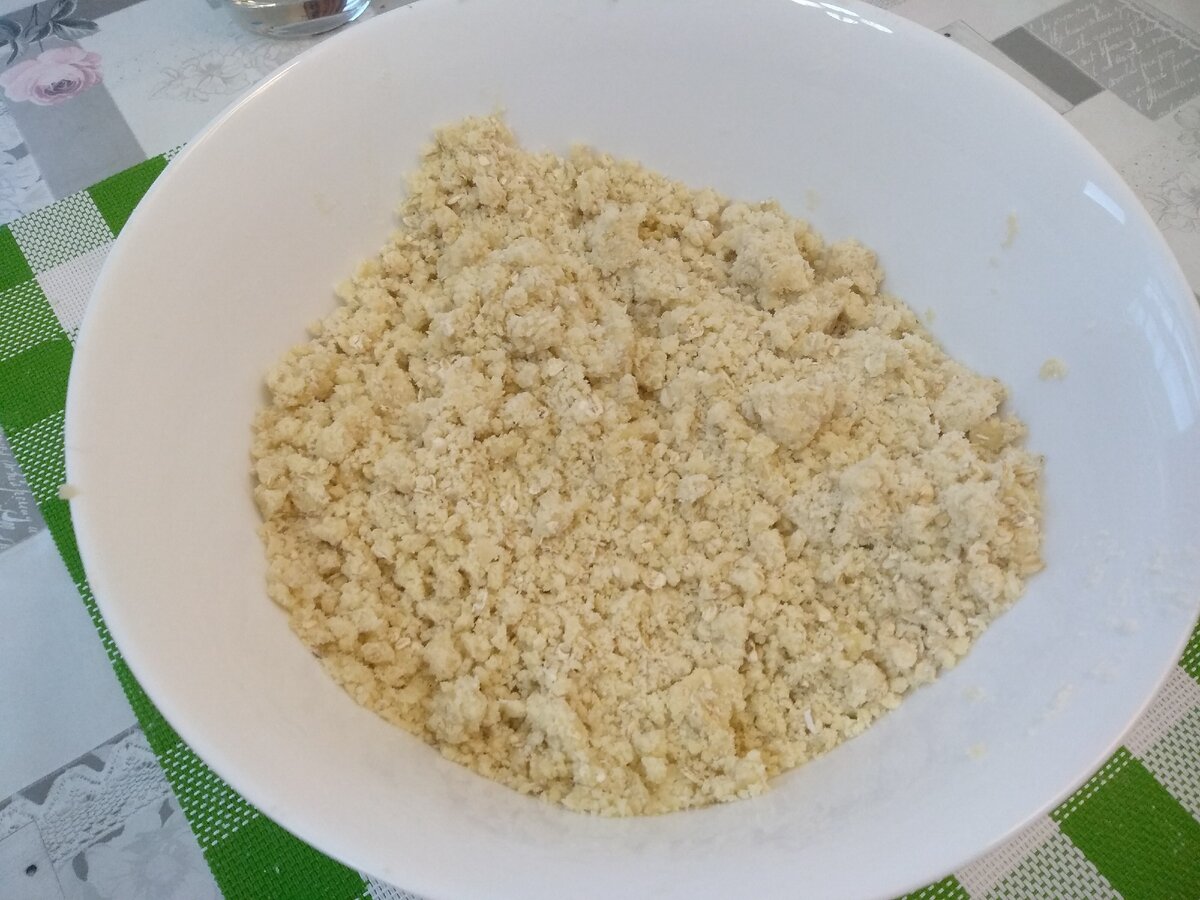 Выкладываем крошку в форму утрамбовывая и формируя бортик. Примерно треть крошки оставляем для посыпки сверху.