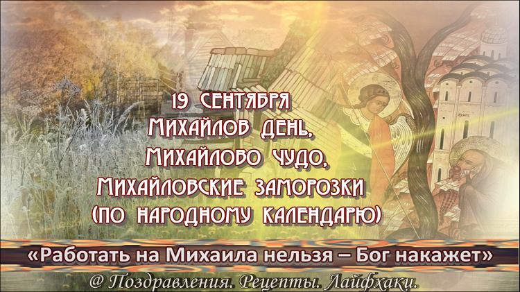 Здравствуйте! В народном календаре день имеет интригующие названия – Михайлово чудо, Михайлов день, и сегодня постараемся разобраться, в чем же заключается чудо этого дня… Верующие в этот день вспоминают Архистратига Михаила и его чудо в Хонех (IV век). Архангела Михаила считали защитником веры и борцом против зла, способным свергнуть дьявола. Известно два случая сотворения чуда – когда Михаил излечил немую девочку, указав её отцу, источник из которого придет исцеление. Когда девочка заговорила, её отец в честь Архистратига Михаила воздвиг храм. И второе проявление чуда – спасение храма от разрушения язычниками (IV век). О сотворении чуда народ всегда помнил и в этот день в поле не работали, чтобы избежать Божьей немилости. С этого дня возможны утренние заморозки, которые в народе называли – михайловскими утренниками. В народе день еще называли Михайловские заморозки и верили, что Михаил, спустившись сегодня с небес, вымораживает всё зло на земле. С древних времен славяне 19 сентября