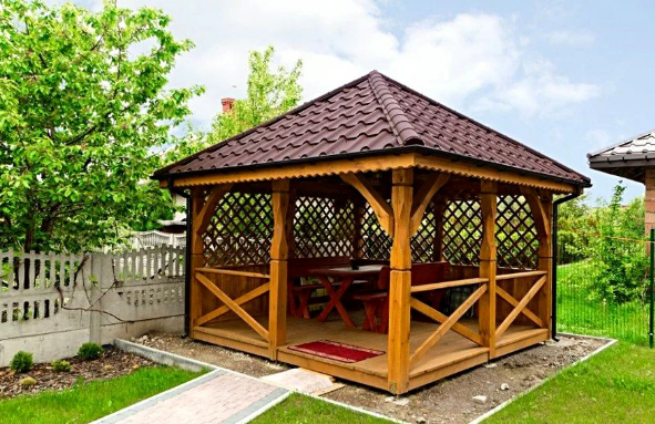 Беседка послужит вам, и когда вы будете нуждаться в отдыхе после работы в саду или на огороде. Так же она защитит вас от палящего знойного солнца и от проливного дождя.