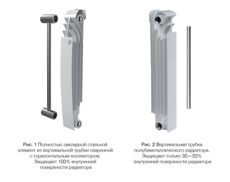 В то же время, на рынке присутствуют так называемые полубиметаллические радиаторы. Они состоят из стальных вертикальных трубок и горизонтальных алюминиевых коллекторов. Делается это для упрощения технологии производства и удешевления изделий. В зависимости от межцентрового расстояния, площадь контакта алюминиевой поверхности с теплоносителем может доходить до 70%, поэтому ни о какой действенной защите алюминия речи не идет. Чтобы не вводить потребителей в заблуждение, такие радиаторы следует называть не биметаллическими, а алюминиевыми со стальными вертикальными трубками.