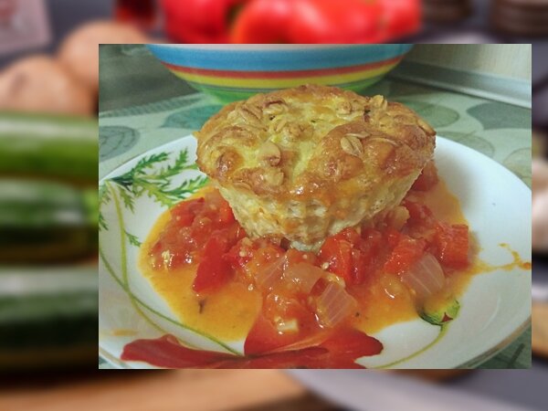 На тарелку выкладываем несколько ложек овощного соуса. Сверху ставим маффин. Можно подавать с мясом или как самостоятельное блюдо.