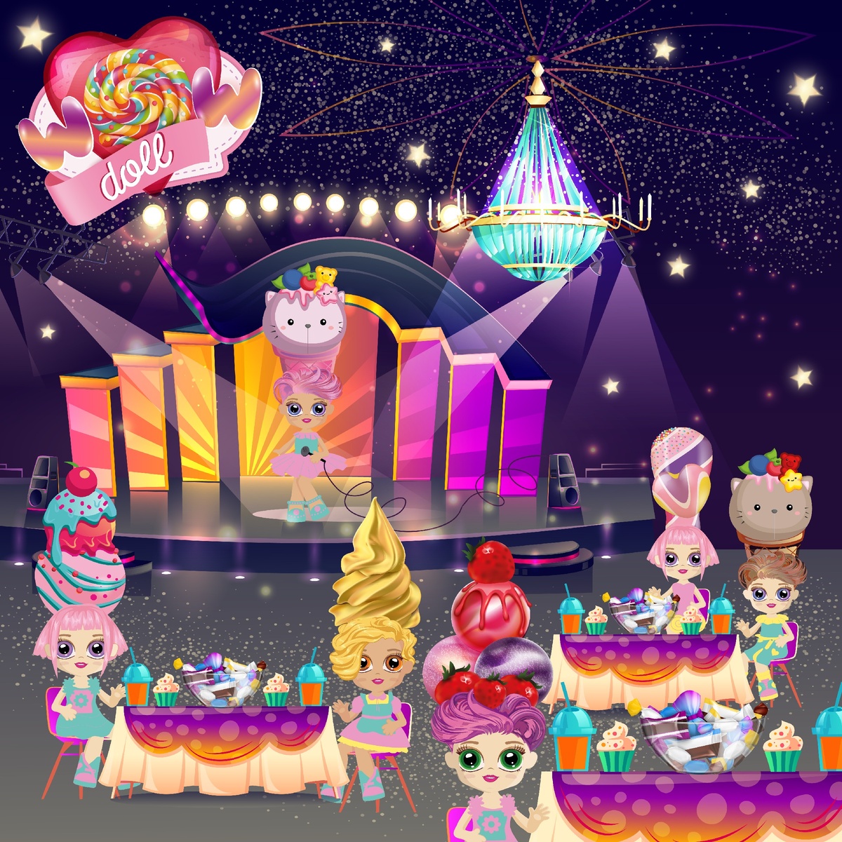 Когда Сластенки WOWDOLL вошли в концертный зал, там стояли маленькие розовые стульчики, маленькие белые столики, на которых были вазочки с конфетками. Стены были красиво украшены блестящими бусинками и камешками. С потолка свисала большая стеклянная люстра, которая при попадании света окрашивала стены в радужные цвета.